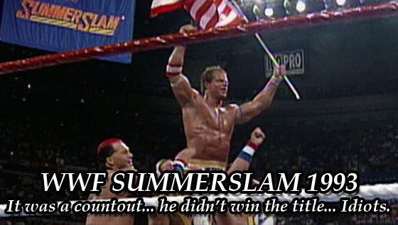 It starts with Wrestlemania IX… where Bret Hart lost the WWF title to Yokozuna… who would then lose the WWF title to Hulk Hogan in an impromptu match… who would then do fuck all with the title before dropping it back to Yokozuna at the King of The Ring PPV, which would signal the final appearance of Hogan in the WWF for eight years. Yokozuna would then hold an open challenge on the U.S.S. Intrepid, where many have tried (and failed) to bodyslam the 500-pound behemoth. Then, when all was said and done, along came Lex Luger to fulfill the deed, earning himself a shot (his “only shot” according to Jim Cornette) at the champ at Summerslam. What followed was a cross-country tour, kissing babies and getting support from the paid extras posing as locals.