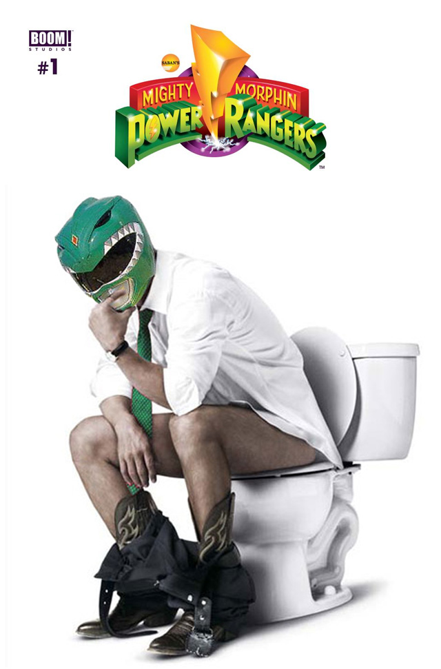 For what it’s worth, the image itself was done years ago – it’s even been used as a thumbnail for one of my older video reviews. It’s essentially someone sitting on the john with a Green Ranger helmet added on and the tie recolored green. (I believe it’s from a poster for a George W. Bush biopic or something; can’t recall which one, but the cowboy boots are a dead giveaway.) However, with Boom Studios offering blank cover editions of their MMPR comics, it seems like a no-brainer to produce a custom cover of my own.