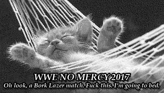 Full disclosure: I did not watch No Mercy live on the WWE Network… because Star Trek: Discovery just debuted and new Star Trek will always take top priority over a B-level WWE show. Saving my thoughts for another time, but I thought it was a good start. There were some bits I didn’t care for, but there was enough for me to like that I’d be willing to give this show a follow and that’s as far as I’ll go.
