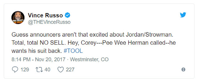 It all began with Russo tweeting about the lack of enthusiasm commentators had over the Jason Jordan vs. Braun Strowman match… which, to be fair, lacks anything worth being excited about: