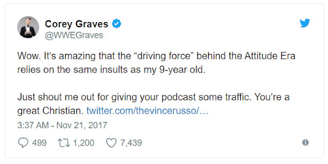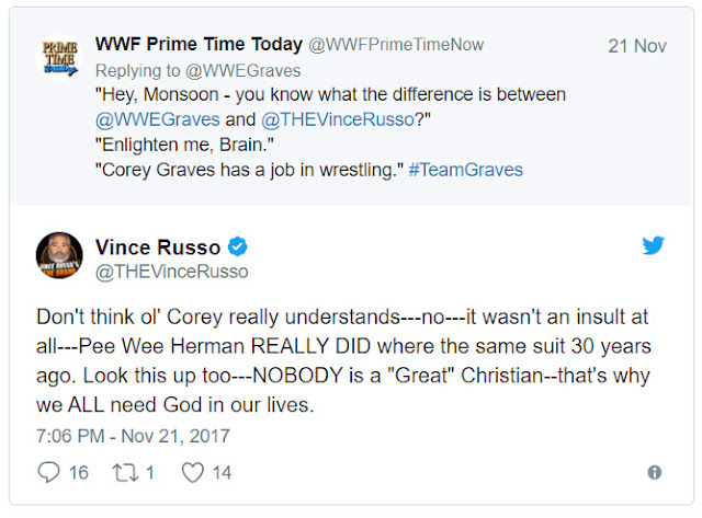 This brief exchange between WWE commentator Corey Graves and former WWE/WCW/TNA head writer Vince Russo a couple days ago was apparently newsworthy for some reason, so let’s check out said posts after the break…
