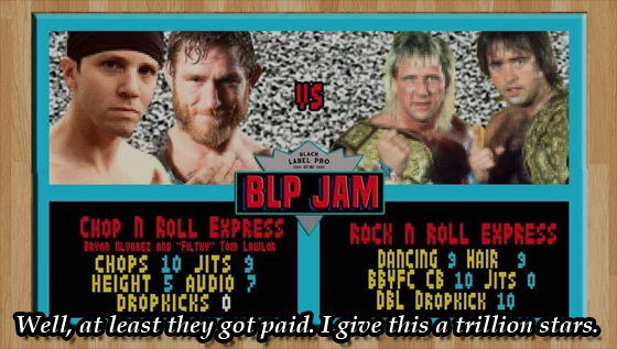 So I had something else planned for tonight, but I’ve decided to hold it off so I can work on this other video I have planned for tomorrow, so in lieu of that, I want to offer some brief thoughts on the Black Label Pro Wrestling BLP Jam event that took place this past Saturday. It’s not something that I would’ve gone for normally, but this card had a particular hook that piqued my interest; a marquee match between legendary tag-team the Rock N Roll Express and the tag-team of UFC/MMA fighter guy “Filthy” Tom Lawlor (he of the Shockmaster entrance on that one MMA show) and Mr. Minus Five Stars himself, Bryan Alvarez. So I decided, “Huh. This sounds interesting.” And thus, I signed up for a Powerbomb.TV subscription that I might keep for the first month at the very least and look for other stuff to talk about. And thus… here we are.