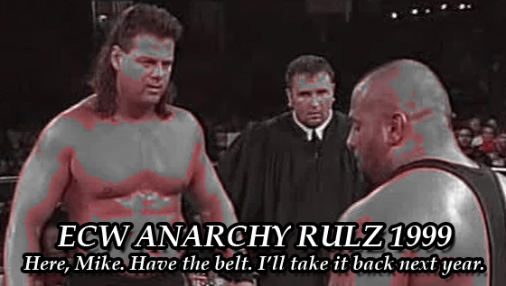 So I thought we’d have a change of pace and watch an ECW PPV instead. I’ve decided to go with Anarchy Rulz 1999 for a couple reasons. The first and perhaps most significant reason is that this was the first ECW PPV to air in Canada and as such, the first time I had been exposed to that particular product. Up until that point, ECW was a thing that I read about in wrestling magazines (or as some would prefer to call them, the “Apter Mags”) and only knew the basic bits through third hand accounts. So this was a good starting point to jump on.