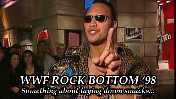 Today is the Rock’s birthday, you stupid son of a bitch. And to celebrate the occasion, I decided to check out the only PPV named after the People’s Champ – the December 1998 edition of the WWF In Your House PPV series dubbed, appropriately enough, Rock Bottom. Though to be fair, this show isn’t as bad as I’m making it sound from the get-go; there’s a couple fun bits here and there, but I think it’s safe to say that this isn’t exactly one of the finer moments of the much-vaunted WWF Attitude Era.