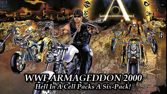 The final WWF PPV of the year 2000… and it’s headlined by a six-man Hell In A Cell match concocted by then-commissioner Mick Foley to bring pain to reigning and defending WWF Champion Kurt Angle, coupled with Vince’s efforts to prevent the match from happening… even though he’s the chairman and the owner, which means he could easily overrule Mick if he wanted to, but I guess that would make too much sense.