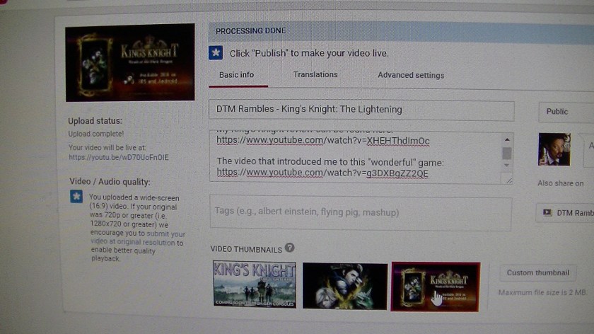 Bottom of the screenshot shows three thumbnails; my “custom” King’s Knight image is one of them. I was almost tempt to use that as a thumbnail, but that would attract dumbasses. So I went with the generic ad that constitutes my third choice.