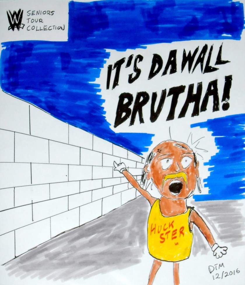 Been considering putting some doodles of mine up online for all to enjoy or mock, whatever floats your boat. Here’s a doodle of the Huckster pointing at a wall, somewhat inspired by one of Hogan’s WCW promos during the company’s final years. The markers I used aren’t fantastic, but they worked well enough for a quick thing.